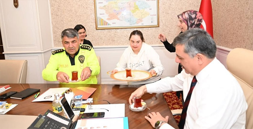 Erzurum Valisi Mustafa Çiftçi, “Valiliğimizin gülleri” olarak adlandırdığı down sendromlu özel çocuklar Çağla Okyay ve Elif Ademoğlu’nu makamında ağırladı. Çağla ve Elif, valilikte göreve başlayarak, gün boyu misafirlere hizmet ettiler....