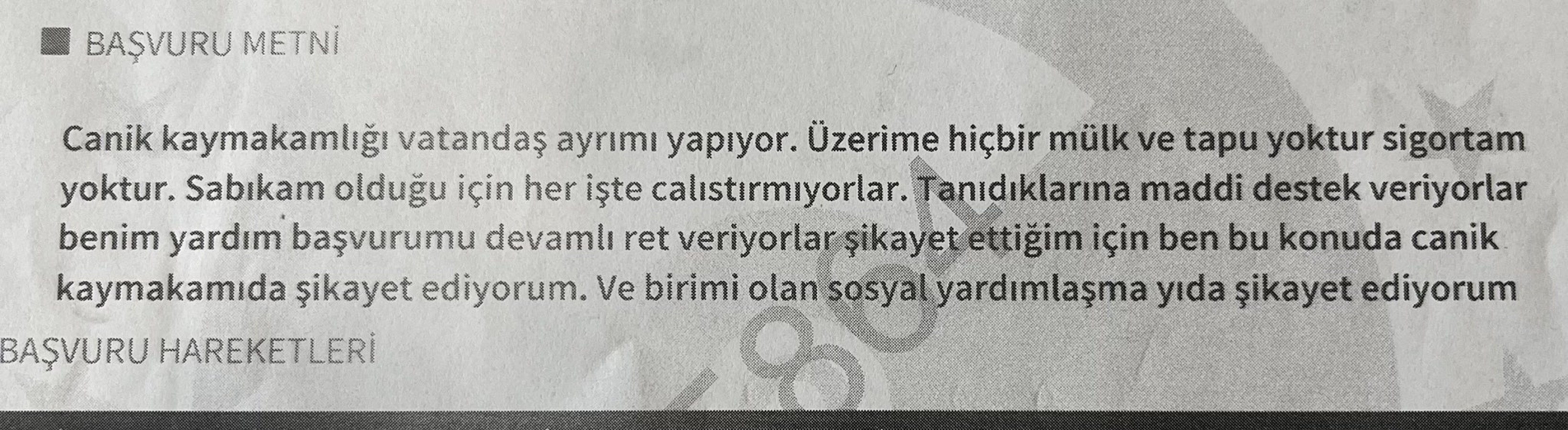 Canik ilçesinde yaşayan bir vatandaş CİMER üzerinden hem Canik Kaymakamlığı'nı hem de Kaymakam Şeref Aydın'ı şikayet etti. Vatandaş, CİMER başvuru metnine, "Canik Kaymakamlığı vatandaş ayrımı yapıyor. Üzerime hiçbir mülk ve tapu yoktur, sigortam yoktur. Sabıkam olduğu için her işte çalıştırmıyorlar. Tanıdıklarına maddi destek veriyorlar, benim yardım başvurumu devamlı reddediyorlar, şikayet ettiğim için. Ben bu konuda Canik Kaymakamını da şikayet ediyorum. Ve birimi olan sosyal yardımlaşmayı da şikayet ediyorum" yazdı.