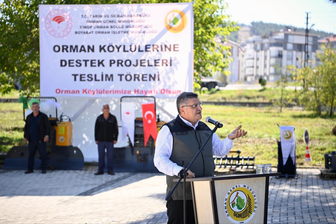 Vali Dr. Mustafa Özarslan, ORKÖY destekleri kapsamında Boyabat’ta gerçekleştirilen “makine ve ekipman teslim” törenine katıldı. Törende konuşan Vali Özarslan, "Sinop'umuzun yüzde 68,6'sı ormanlarla kaplı olup, ilimizde toplam 464 köyümüz var. Bu köylerden yalnızca 2'si orman köyü değil. Hal böyle iken 2023 ve 2024 yılında Sinop’ta ORKÖY desteklerinden daha çok faydalanılması için 8 ilçemizde eğitimler düzenledik. Muhtarlarımızı, üreticilerimizi ve orman köylümüzü bilgilendirdik. Bu yıl şu ana kadar 232 orman köylümüze 50 milyon TL ORKÖY desteği sağlamış olduk. ORKÖY; orman köylüsünün yol arkadaşı, olduğu sürece orman köylümüzü her konuda desteklemeye devam edeceğiz. Malzemelerini teslim ettiğimiz üreticilerimize, orman köylümüze hayırlı olsun dileklerimi iletiyorum” diye konuştu.