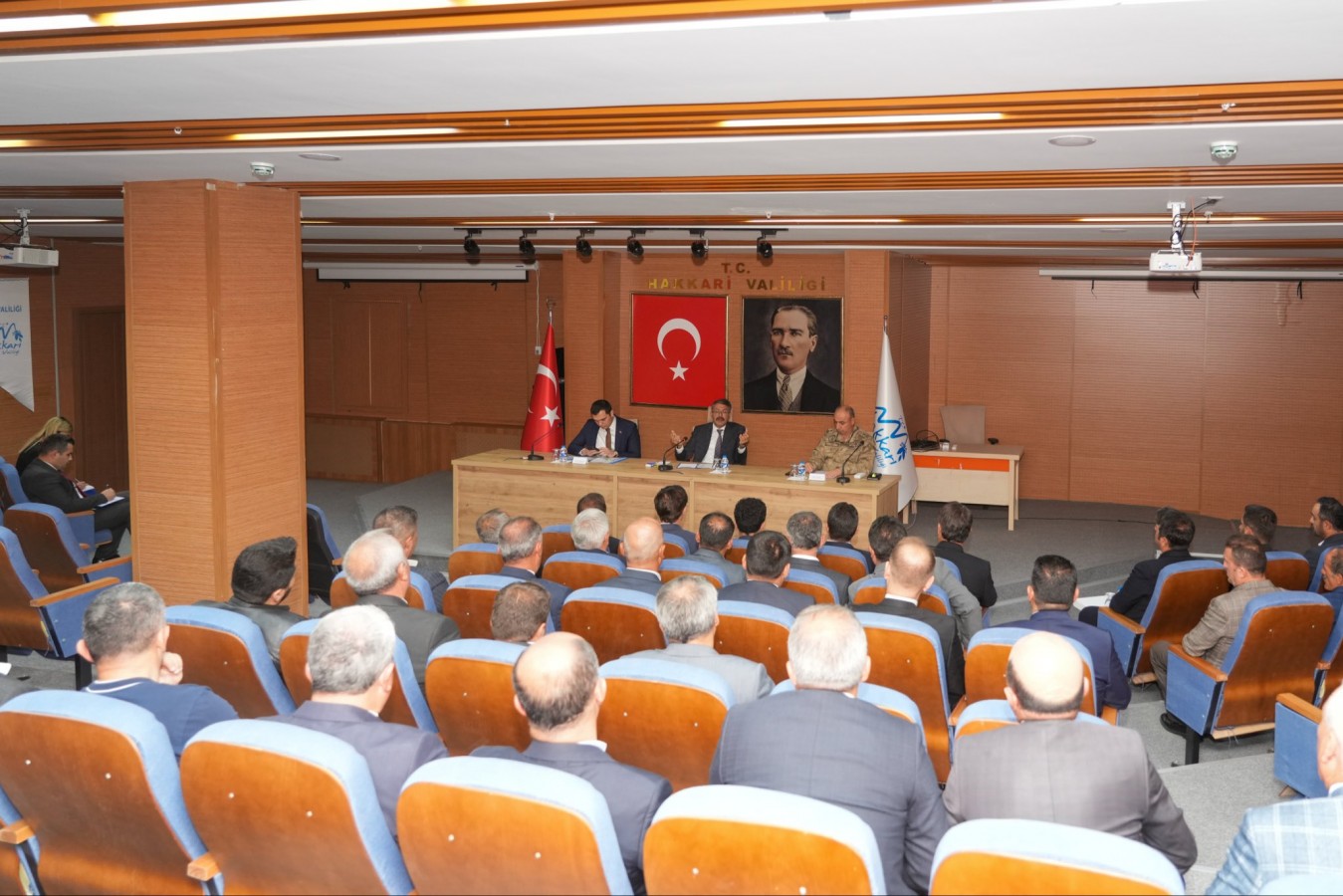 Hakkâri Valiliği Konferans Salonu'nda Vali Ali Çelik başkanlığında; Vali Yardımcısı Cüneyt Zor, İl Jandarma Komutanı Tuğgeneral Cafer Öz, ilgili kamu kurumlarının müdür ve temsilcileri ile Hakkâri’nin Merkez ilçesine bağlı köy muhtarlarının katılımlarıyla bir toplantı yapıldı.