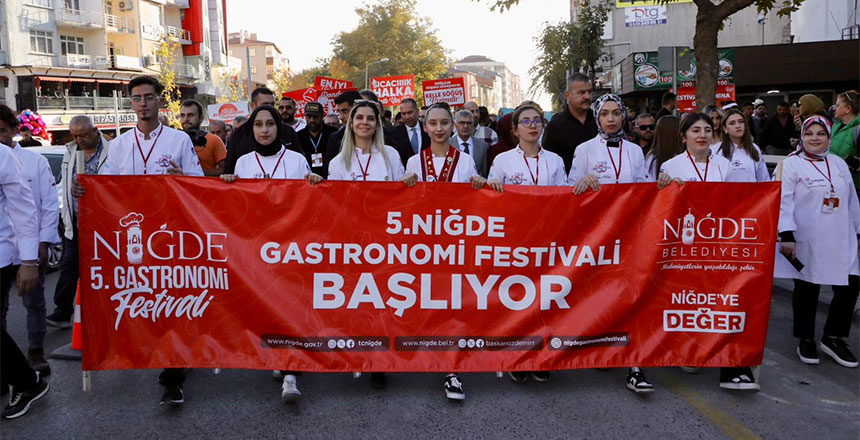 Niğde Valiliği ve Niğde Belediyesi iş birliğinde düzenlenen “5. Niğde Gastronomi Festivali”, kortej yürüyüşüyle başladı. Niğde Merkez’de gerçekleştirilen etkinliğe, Niğde Valisi Cahit Çelik ve eşi Nermin Çelik, Niğde Belediye Başkanı Emrah Özdemir ve eşi Duygu Özdemir, protokol üyeleri, yerli ve yabancı şefler, akademisyenler, kadın kooperatifleri, yerel üreticiler ve vatandaşlar katıldı. Derbent Mevkii’nden başlayan kortej yürüyüşünün ardından festival ateşi yakılarak, kentin yöresel lezzetlerinin tanıtılacağı etkinlikler resmen başlatıldı.