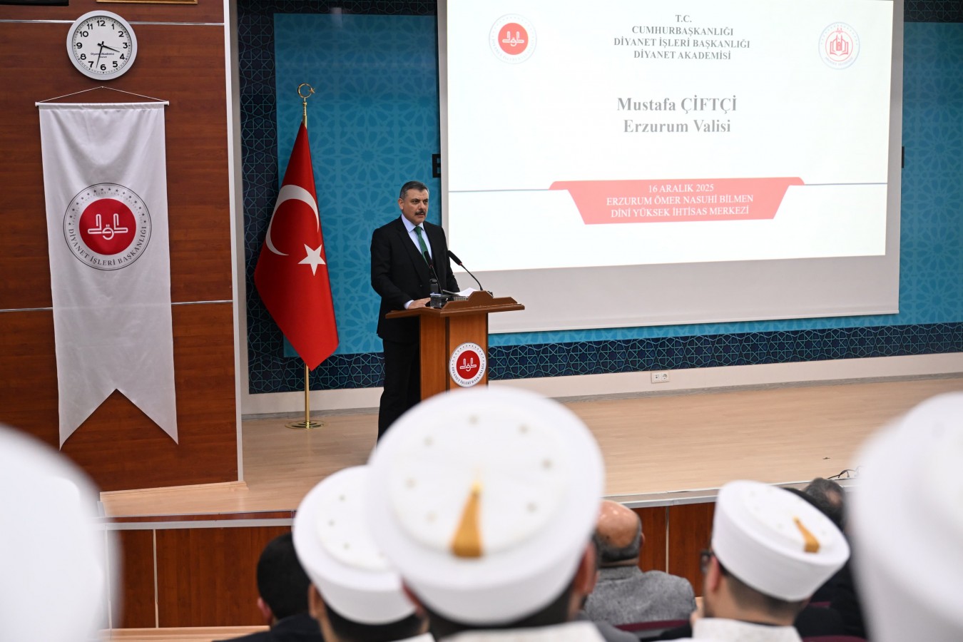 Erzurum Valisi Mustafa Çiftçi, Diyanet Akademisi bünyesinde düzenlenen 3. Dönem Mesleki Eğitim Programını başarıyla tamamlayan din görevlileri için gerçekleştirilen Mezuniyet Töreni’ne katıldı. Saygı duruşu ve İstiklal Marşı’nın ardından Kur’an-ı Kerim tilavetiyle başlayan programda konuşan Vali Çiftçi, din hizmetinin rastgele yürütülen bir faaliyet olmadığını; bilgi, hikmet ve adanmışlıkla icra edilmesi gereken önemli bir emanet olduğunu ifade etti.