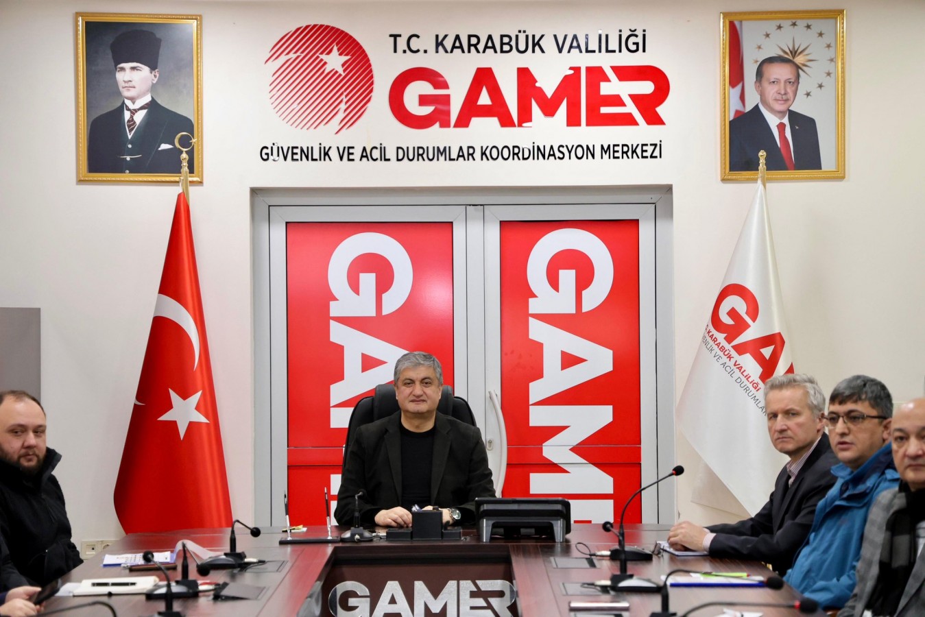 Karabük Valisi Mustafa Yavuz'un başkanlığında 26.12.2025 tarihi gecesinden itibaren kent genelinde etkili olan soğuk hava ve kar yağışı nedeniyle yürütülen çalışmalar hakkında görevli kurum ve kuruluşların amir ve müdürlerinden bilgi almak, alınan tedbirleri değerlendirmek amacıyla Güvenlik ve Acil Durumlar Koordinasyon Merkezi'nde (GAMER) gözden geçirme ve koordinasyon toplantısı gerçekleştirdi.