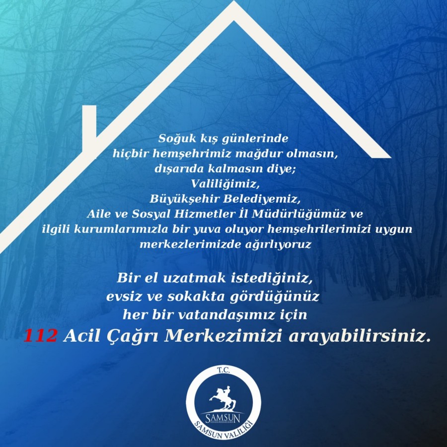 Havaların soğumasıyla birlikte Samsun Valisi Orhan Tavlı'dan önemli bir çağrı geldi. Vali Tavlı, "Kıymetli Samsunlular; lütfen, soğuk hava şartlarının etkisinin sürdüğü bu dönemde kalacak yeri olmayan hemşehrilerimizi 112 Acil Çağrı Merkezi’ni arayarak bildirelim. Hemşehrilerimizi Valiliğimizin koordinasyonunda Büyükşehir Belediyemiz, İlçe Belediyelerimiz, Aile ve Sosyal Hizmetler İl Müdürlüğümüz, Sosyal Yardımlaşma ve Dayanışma Vakıflarımız ve ilgili kurumlarımızla birlikte barınmaları için uygun yerlere yerleştirelim" ifadelerini kullandı.