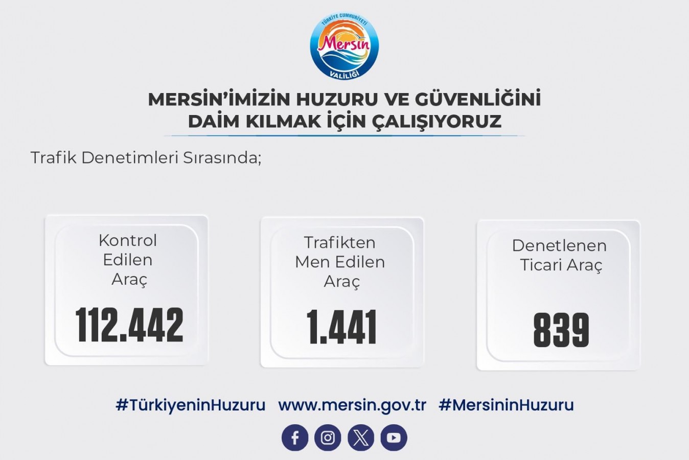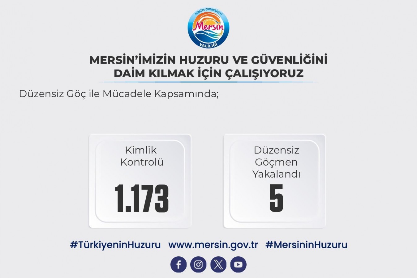 Toplantıda açıklama yapan Vali Toros, "Mersin’imizin huzuru ve güvenliğini daim kılmak için emniyet, jandarma ve sahil güvenlik birimlerimiz gece gündüz çalışmaya devam ediyor. 29 Aralık 2025- 4 Ocak 2026 tarihleri arasında çeşitli suçlardan kesinleşmiş hapis cezası bulunan ve aranan şahıslardan toplam 644 şahıs yakalanarak adli mercilere teslim edildi. Trafik denetimleri kapsamında; 112 bin 442 araç kontrol edildi, bin 441 araç trafikten men edildi, 839 ticari taksi denetlendi. Düzensiz Göç ile Mücadeleye Yönelik Huzur Uygulaması kapsamında bin 173 kimlik kontrolü yapıldı. 5 yabancı, Düzensiz Göçmen Ön Kabul ve Sevk Merkezine gönderildi" ifadelerini kullandı.