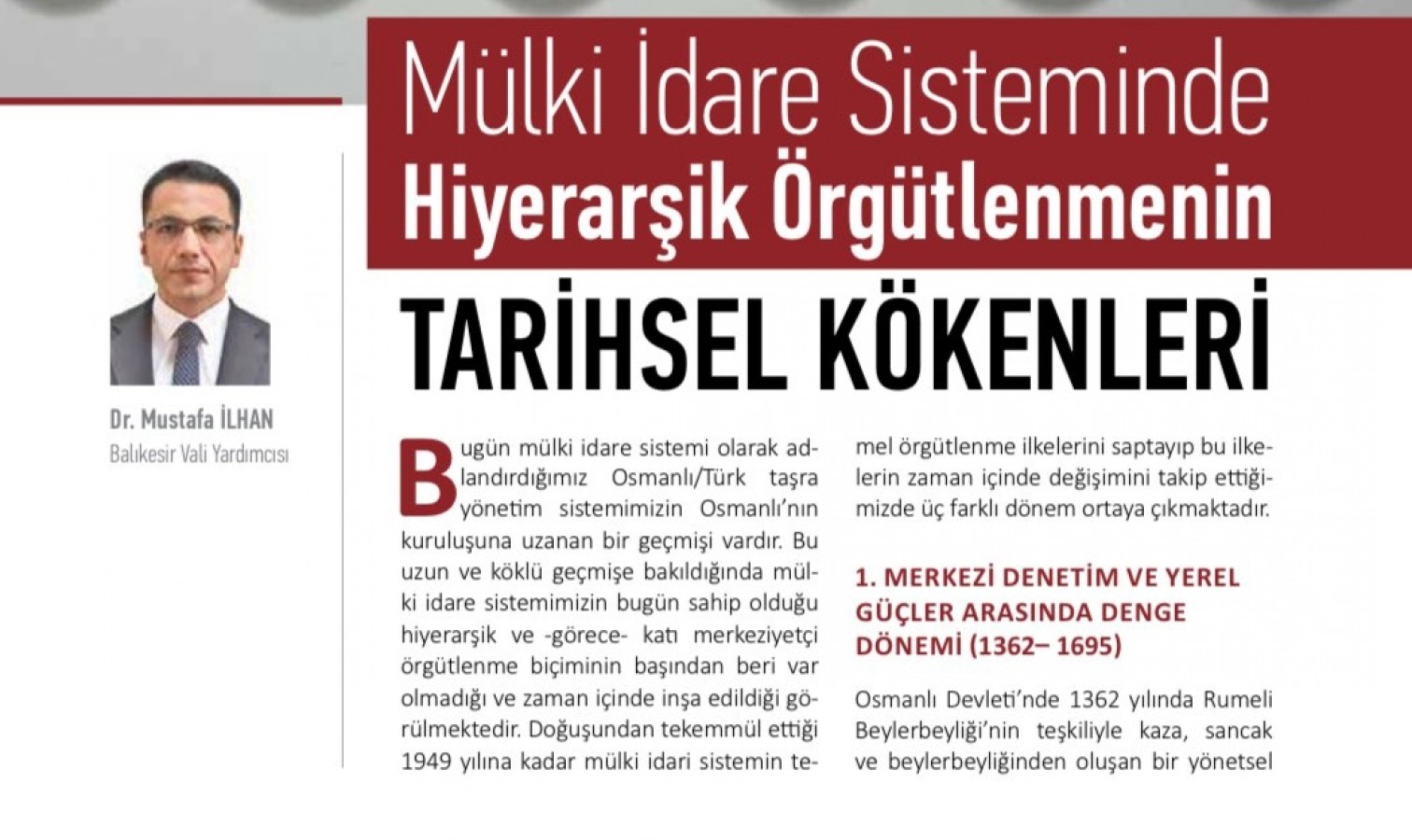 Balıkesir Vali Yardımcısı Dr. Mustafa İlhan, İdarecinin Sesi Dergisi’nde “Mülki İdare Sisteminde Hiyerarşik Örgütlenmenin Tarihsel Kökenleri” başlıklı bir yazı kaleme aldı....