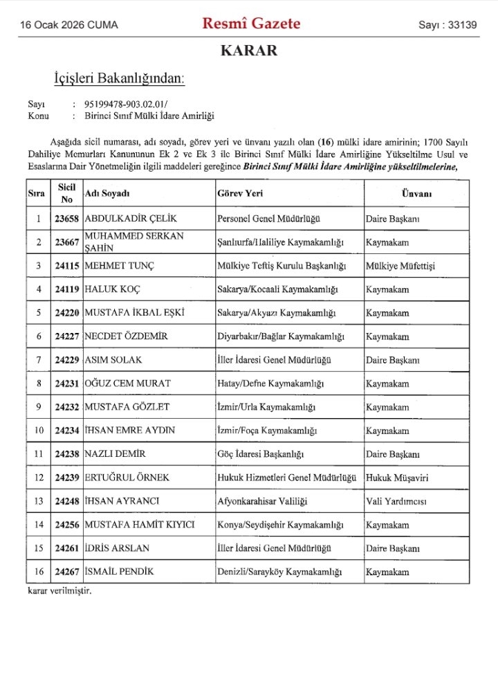 İçişleri Bakanlığı tarafından alınan ve 16 Ocak 2026 tarihli Resmi Gazete'de yayımlanan kararla, 1700 sayılı Dahiliye Memurları Kanunu'nun Ek 2 ve Ek 3'üncü maddeleri uyarınca 16 mülki idare amiri, Birinci Sınıf Mülki İdare Amirliğine yükseltildi