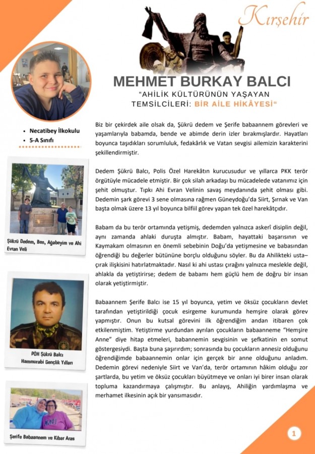 Kırşehir Vali Yardımcısı Alper Balcı'nın oğlu Mehmet Burkay Balcı, ahilik kültürünü anlattı. Necatibey İlkokulu'na giden Mehmet Burkay Balcı, “Ahilik Kültürünün Yaşayan Temsilcileri: Bir Aile Hikayesi" başlığını yerdiği yazısında dedesi Şükrü Balcı, babaannesi Şerife Balcı ve babası Alper Balcı'yı anlattı.