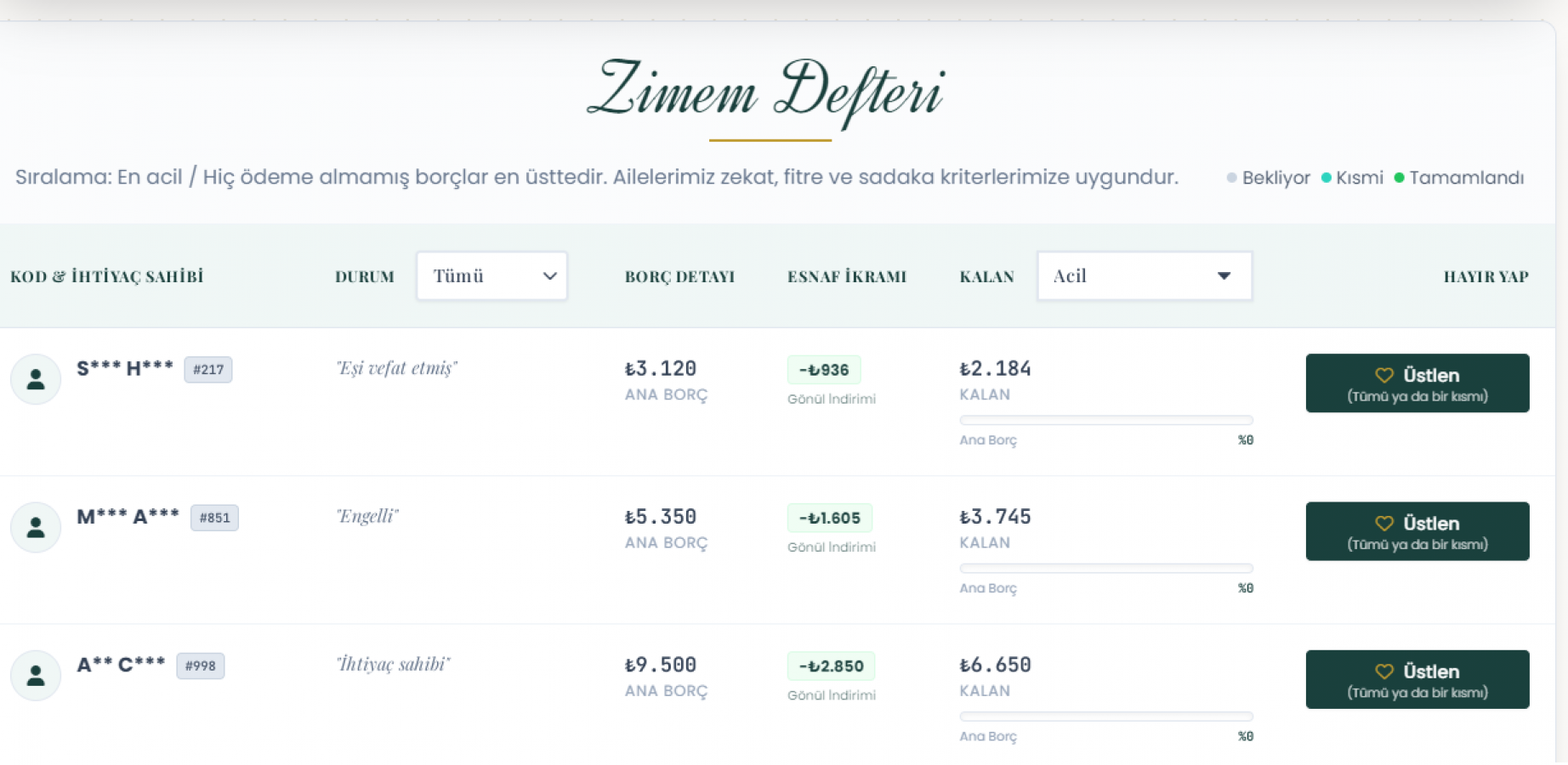 Aslında Zimem Defteri, Osmanlı'dan günümüze uzanan bir gelenek... İhtiyaç sahiplerinin bakkallardaki veresiye defterlerinin kapatıldığı “zimem defteri” geleneği, Türkiye'de ilk kez dijital ortama taşındı. Hayırsever vatandaşlar, https://zimemdefteri.com/ adresine girerek, ihtiyaç sahiplerine doğrudan ulaşabilecek. Sistem üzerinde de her şey ayrıntısıyla düşünülmüş. İhtiyaç sahipleri rencide edilmeden, bazı bilgiler sisteme yüklendi. Sadece baş harfleri, durumu, borç detayı sistemde yer alıyor. Hayırseverler, bu adrese girerek, yardım yapmak istediği kişiyi seçiyor ve bir tıkla bir vatandaşın gönlüne dokunmuş oluyor.