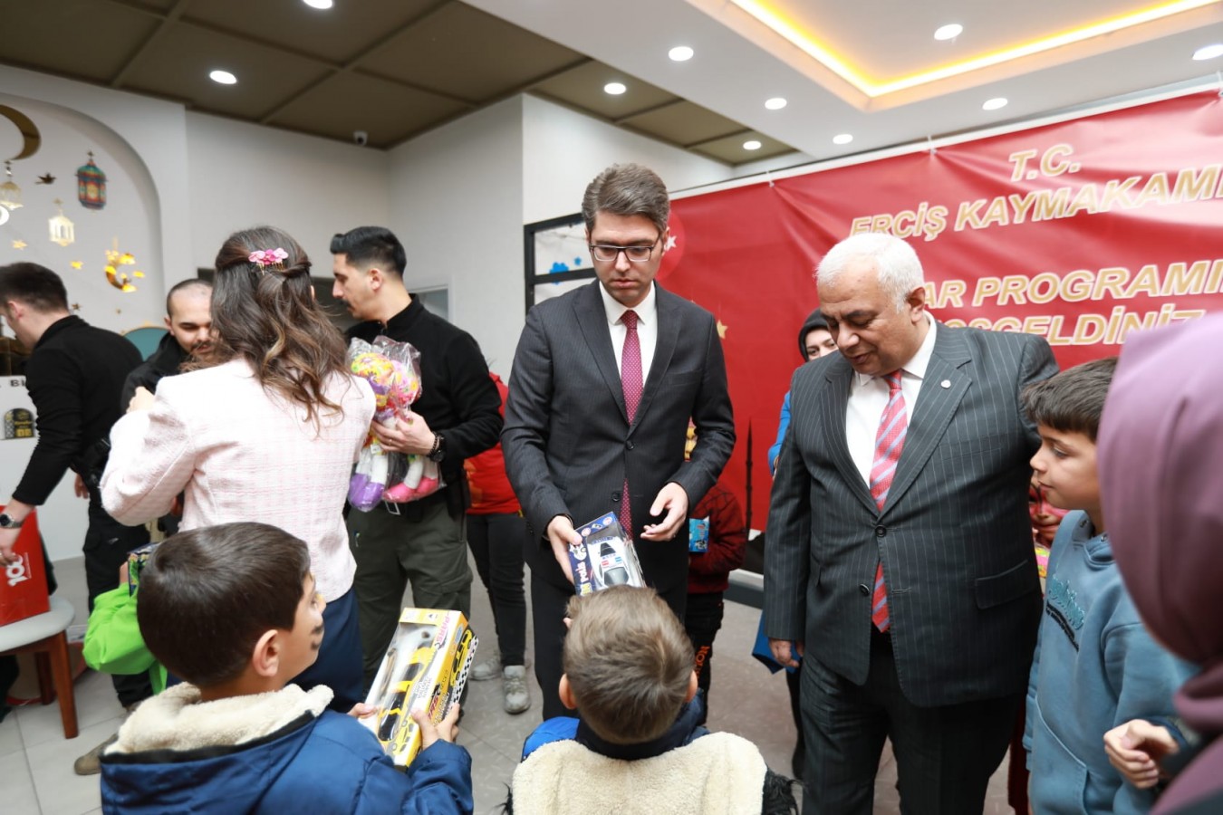 Erciş Kaymakamlığı himayelerinde Dünya Yetimler Günü vesilesiyle düzenlenen iftar programına; Kaymakam Murat Karaloğlu, eşi Gamze Karaloğlu, Erciş Ticaret Odası Başkanı Murat İzgi, daire amirleri, misafir aileler ile birlikte ebeveyn kaybı yaşayan çocuklar katıldı.
