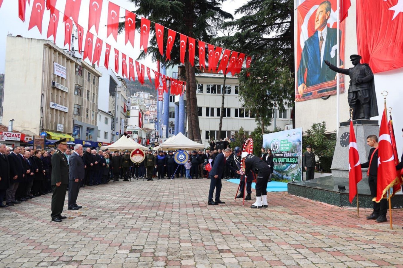 7 Mart Artvin’in kurtuluş günü vesilesiyle düzenlenen törenler, Atatürk Anıtı’na çelenk sunulmasıyla başladı. Vali Dr. Turan Ergün, eşi Hülya Ergün, Garnizon Komutanı P. Alb. Enver Örtel, Belediye Başkanı Bilgehan Erdem ve vatandaşların yoğun katılım gösterdiği tören, saygı duruşu ve İstiklal Marşı ile devam etti.