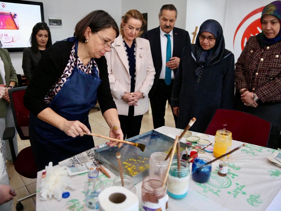Ebru atölyesi etkinliğine katılan Ankara Etimesgut Kaymakamı Özlem Bozkurt Gevrek, ebru teknesinin başına geçerek sanat çalışması yaptı. Kaymakam Gevrek, kadınların zarafetini ve emeğini ebru sanatının ahengiyle anlattı....