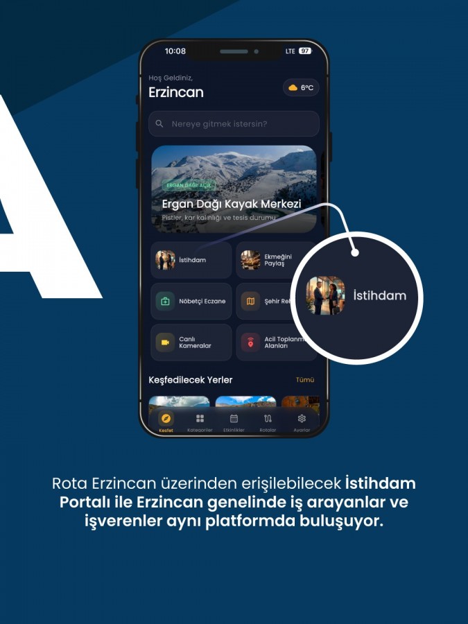 Erzincan Valiliği tarafından hayata geçirilen “Rota Erzincan” mobil uygulaması bünyesinde geliştirilen İstihdam Portalı, iş arayan vatandaşlar ile personel arayışındaki işletmeleri aynı platformda buluşturuyor. Yeni sistem sayesinde Erzincan’da iş arayanlar, kendilerine uygun iş fırsatlarından anlık olarak haberdar olabilecek; işverenler ise ihtiyaç duydukları insan kaynağına daha hızlı ve doğru şekilde ulaşabilecek.