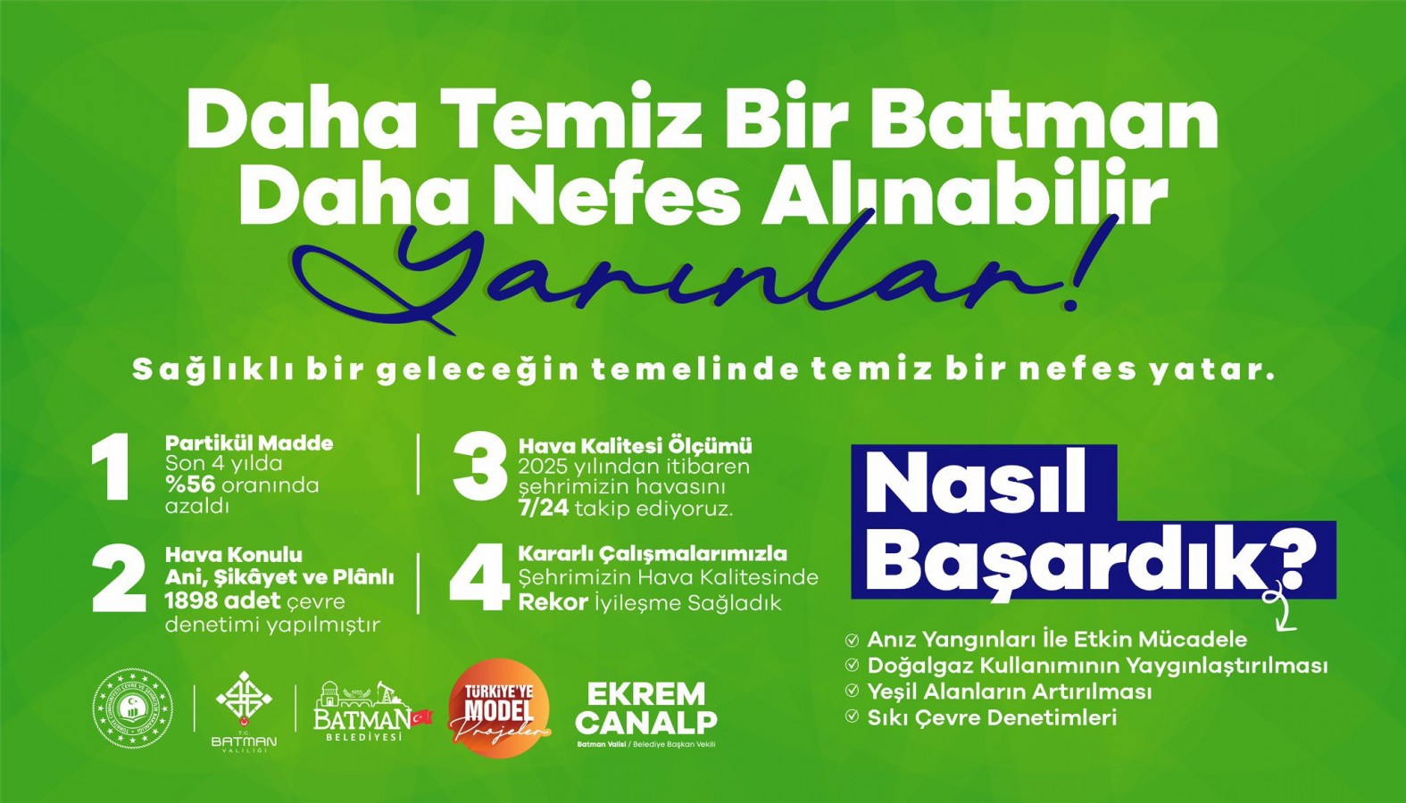 Elde edilen iyileşmede sıkı denetimler ve çevreci yatırımlar belirleyici rol oynadı. Bu kapsamda; bin 898 çevre denetimi gerçekleştirildi. Kurallara uymayan işletmelere toplam 28 milyon 924 bin TL idari ceza uygulandı, yeşil alanlar artırıldı, doğalgaz kullanımı yaygınlaştırıldı, anız yangınlarına karşı etkin mücadele yürütüldü. Tüm bu çalışmalar sayesinde Batman’da hava kalitesi, “sağlıksız” ve “hassas” seviyelerden uzaklaşarak daha güvenli bir noktaya ulaştı. Yetkililer, çevre yatırımları ve denetimlerin aynı kararlılıkla sürdürüleceğini vurgularken, hedefin her vatandaşın daha temiz ve sağlıklı bir havaya kavuşması olduğunu belirtiyor.