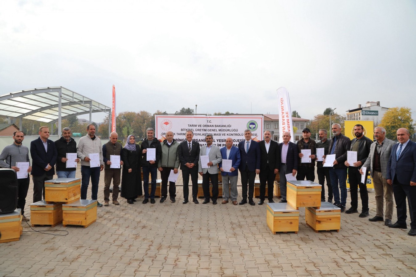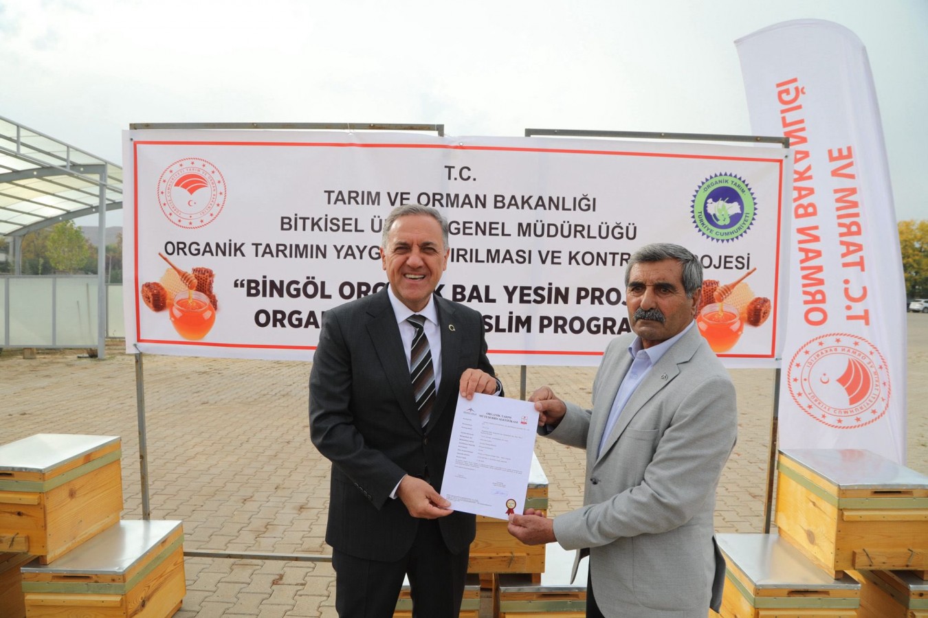 Bingöl Valisi Ahmet Hamdi Usta, “Bingöl olarak arıcılıkta kendimize güveniyor, teraziye çıkıyoruz” diyerek kentte yürütülen organik arıcılık çalışmalarına ilişkin açıklamalarda bulundu. “Bingöl Organik Bal Yesin” projesi kapsamında 2023 ve 2024 yıllarında Organik Tarım Müteşebbis Sertifikasına sahip 15 arıcıya toplam 305 adet organik nitelikli kovan desteği sağlandığını hatırlatan Vali Usta, bu yıl da aynı proje çerçevesinde 15 arıcıya yüzde 75 hibeli 435 organik nitelikli katlı kovan dağıtımı gerçekleştirildiğini belirtti. Böylece toplamda 740 kovanın üreticilere ulaştırıldığı bildirildi.
