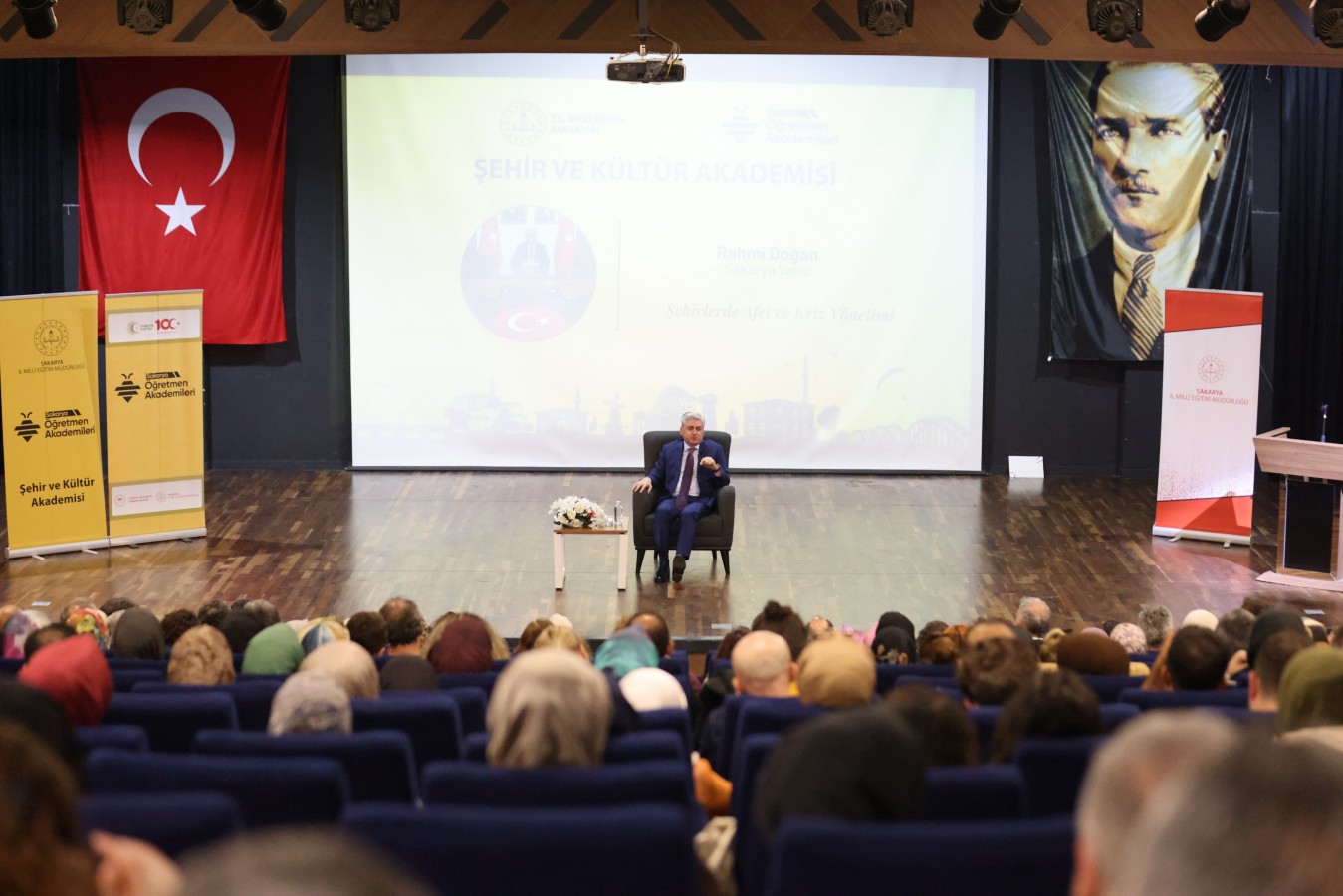 Vali Doğan, "Bu ilk derste şehrimizin 17 Ağustos’ta yaşadığı acılardan doğan tecrübeyle Şehirlerde Afet ve Kriz Yönetimini ele alıyoruz. Sakarya bize gösterdi ki bir şehir, binalarıyla değil afetlere hazırlığı, farkındalığı ve dayanışma kültürüyle güçlüdür. Bugün artık sadece depremi değil; yangınları, selleri ve iklim değişikliğinin getirdiği yeni riskleri de gözeterek toplumsal bir afet bilinci inşa etmek zorundayız” ifadelerini kullandı.
