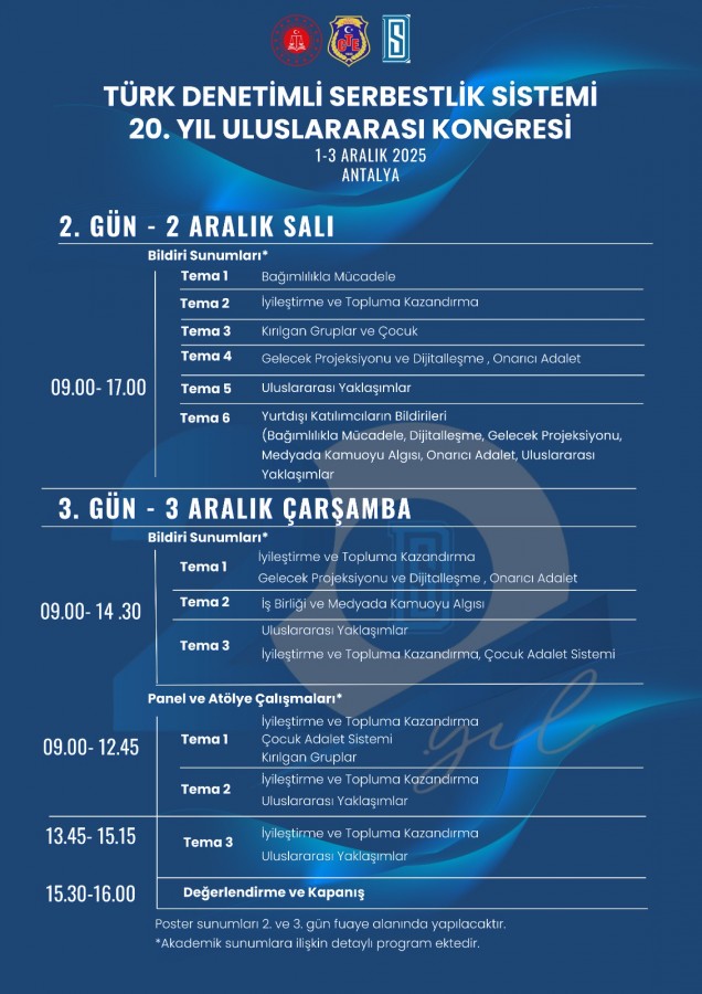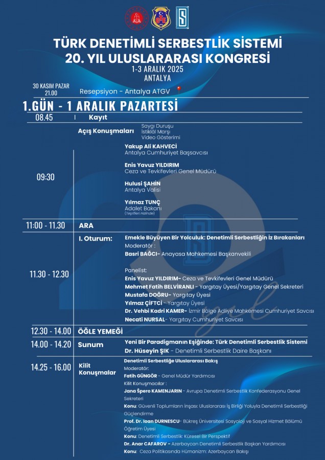 20 Temmuz 2005 tarihinde yürürlüğe giren 5402 sayılı Denetimli Serbestlik Hizmetleri Kanunu ile başlayan bu yolculuk, insan odaklı ve onarıcı adalet anlayışıyla ceza infaz sistemine yeni bir boyut kazandırdı. Türk Denetimli Serbestlik Sistemi'nin 20. yılı dolayısıyla 1–3 Aralık 2025 tarihlerinde, Antalya Adalet Teşkilatını Güçlendirme Vakfı Eğitim ve Sosyal Tesisleri'nde Uluslararası Kongre düzenlenecek.