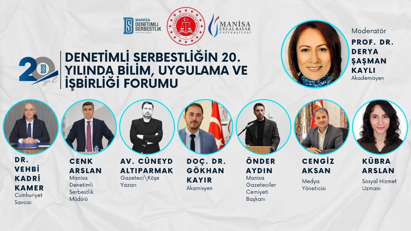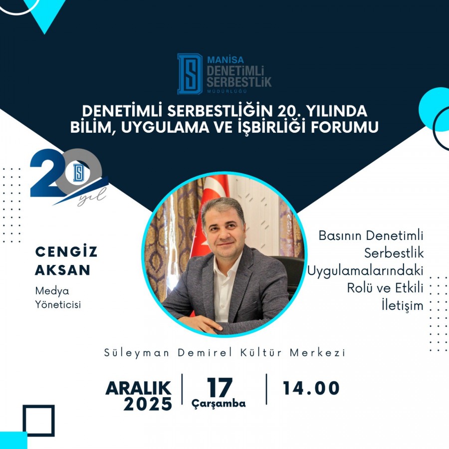 Manisa Denetimli Serbestlik Müdürlüğü ile Manisa Celal Bayar Üniversitesi iş birliğinde, denetimli serbestlik uygulamalarının 20'nci yılı dolayısıyla “Denetimli Serbestliğin 20. Yılında İş Birliği Forumu” düzenlenecek. 17 Aralık 2025 Çarşamba günü saat 14.00’te, Manisa Celal Bayar Üniversitesi Uncubozköy Yerleşkesi’nde bulunan Süleyman Demirel Kültür Merkezi’nde yapılacak foruma alanında uzman akademisyenler, hukukçular, gazeteciler ve sosyal hizmet uzmanları katılacak. Denetimli serbestliğin Türkiye’deki gelişim süreci, güncel uygulamalar ve kurumlar arası iş birliği olanakları akademik ve uygulamalı yönleriyle değerlendirilecek.