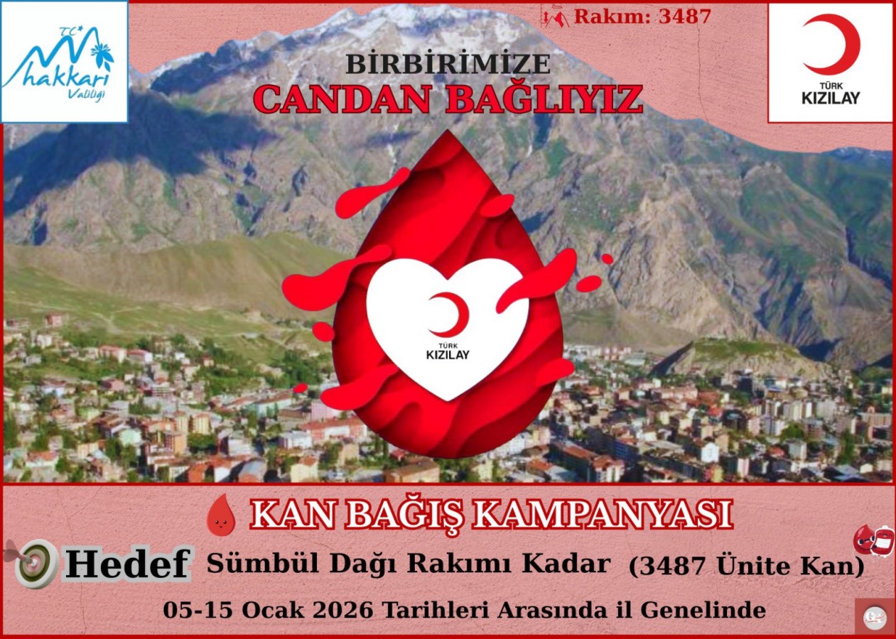 Hakkari Valisi Ali Çelik, 5–15 Ocak tarihleri arasında il genelinde kan bağışı kampanyası düzenleneceğini belirterek, "Kan stoklarının sürdürülebilirliği büyük önem taşıyor. Kampanya kapsamında Sümbül Dağı’nın rakımına atfen 3 bin 487 ünite kan bağışı hedefleniyor. Hakkâri halkı, bu konuda her zaman duyarlı oldu, belirlenen hedefe ulaşılacağına inanıyorum" dedi....