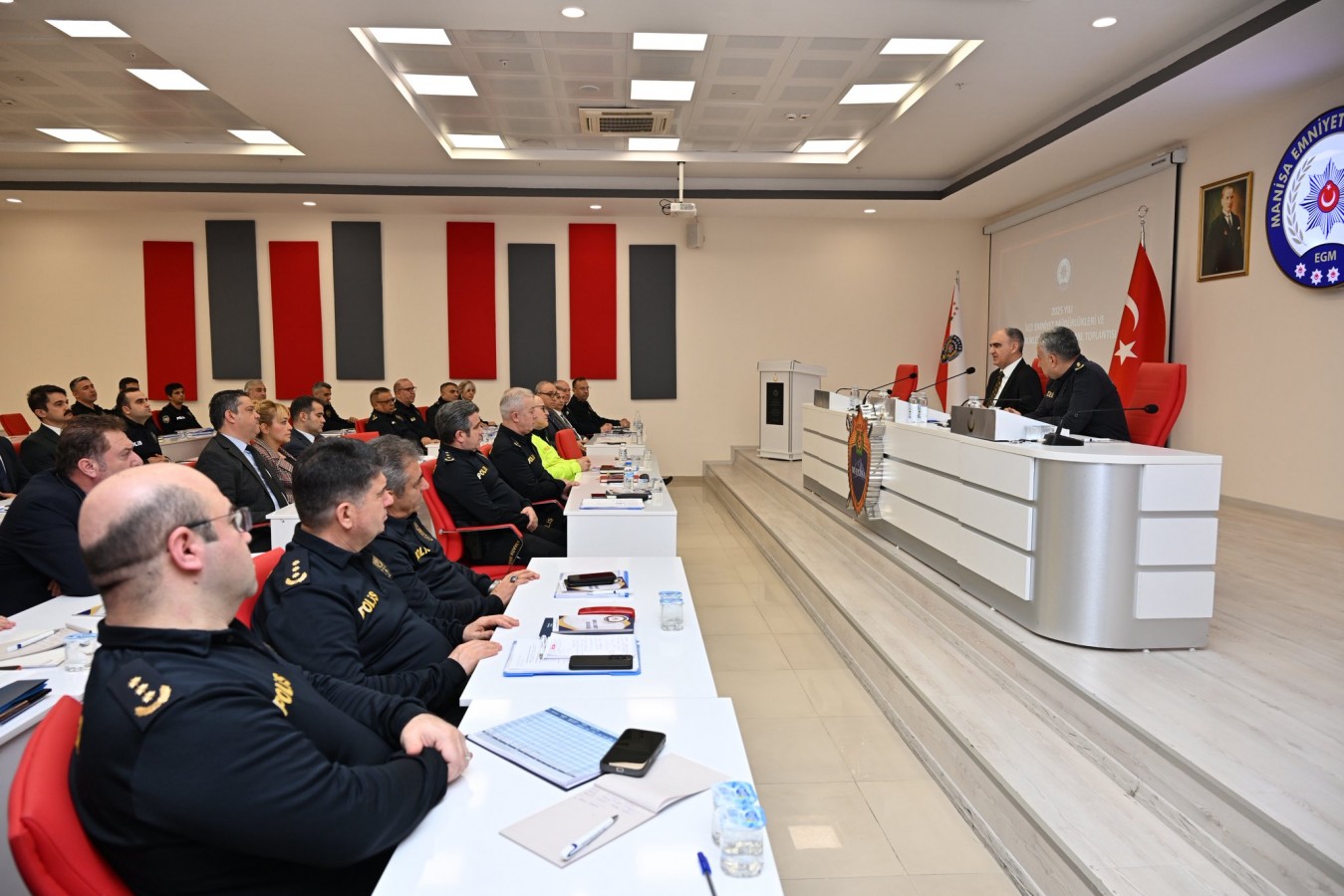 Manisa Valisi Vahdettin Özkan başkanlığında 2025 Yılı İlçe Emniyet Müdürlükleri ve Amirlikleri Değerlendirme Toplantısında yapıldı. Toplantıda risk analizi çalışmaları, önleyici kolluk faaliyetleri, madde temininin önlenmesine yönelik yürütülen etkin mücadele, kadına yönelik şiddetle kararlı mücadele, toplumsal hassasiyetler, vatandaş odaklı hizmet, gelişen teknolojiye uyum ve dijital analiz kapasitesi, yerel eylem planları kapsamında alınabilecek tedbirler, gıda güvenliği değerlendirildi.
