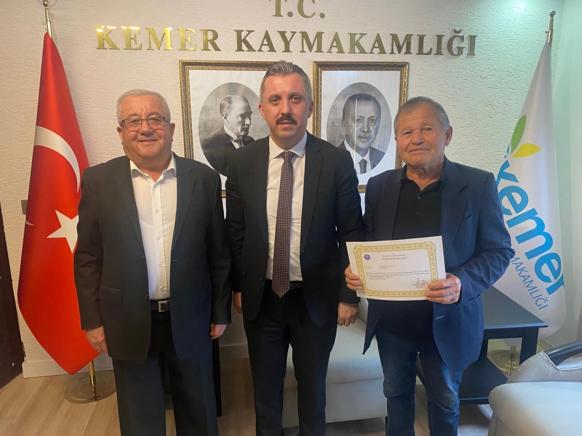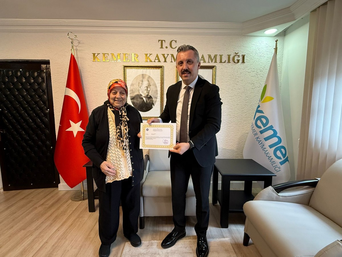 Kemer Kaymakamı Ahmet Solmaz, ilçeye özgü yöresel ürünlerin hazırlanması ve tanıtım sürecine katkı sağlayan, Kemer’in mutfak kültürünü yaşatmak için emek veren gönüllülerle bir araya gelerek, teşekkür belgesi verdi. Kaymakam Solmaz, "İlçenin gastronomi kültürünü gelecek nesillere taşımak ve turizmi güçlendirmek amacıyla yürütülen Coğrafi İşaret alma projesine emek ve destek veren gönüllülerimize teşekkür ediyorum" diye konuştu.