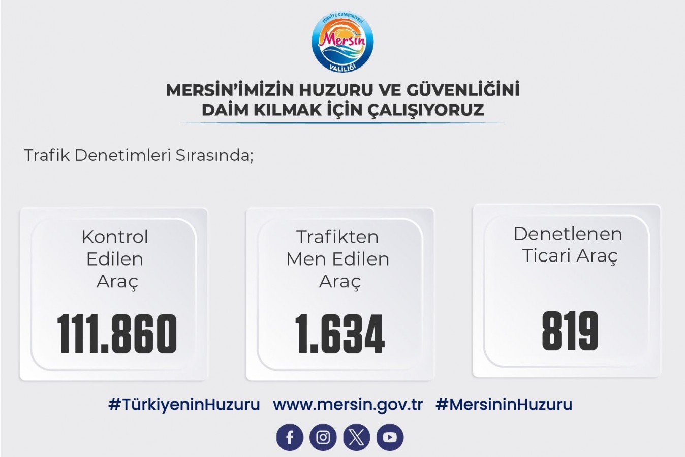 Güvenlik ve Asayiş Değerlendirme Toplantısında konuşan Mersin Valisi Atilla Toros, "Trafik denetimleri kapsamında; 111 bin 860 araç kontrol edildi, bin 634 araç trafikten men edildi, 819 ticari taksi denetlendi" dedi....