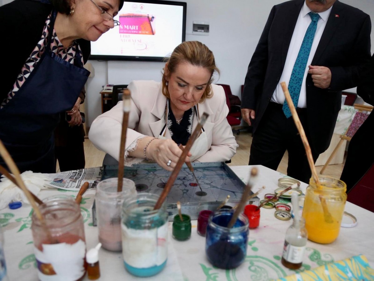 Ebru atölyesi etkinliğine katılan Ankara Etimesgut Kaymakamı Özlem Bozkurt Gevrek, ebru teknesinin başına geçerek sanat çalışması yaptı. Kaymakam Gevrek, kadınların zarafetini ve emeğini ebru sanatının ahengiyle anlattı....