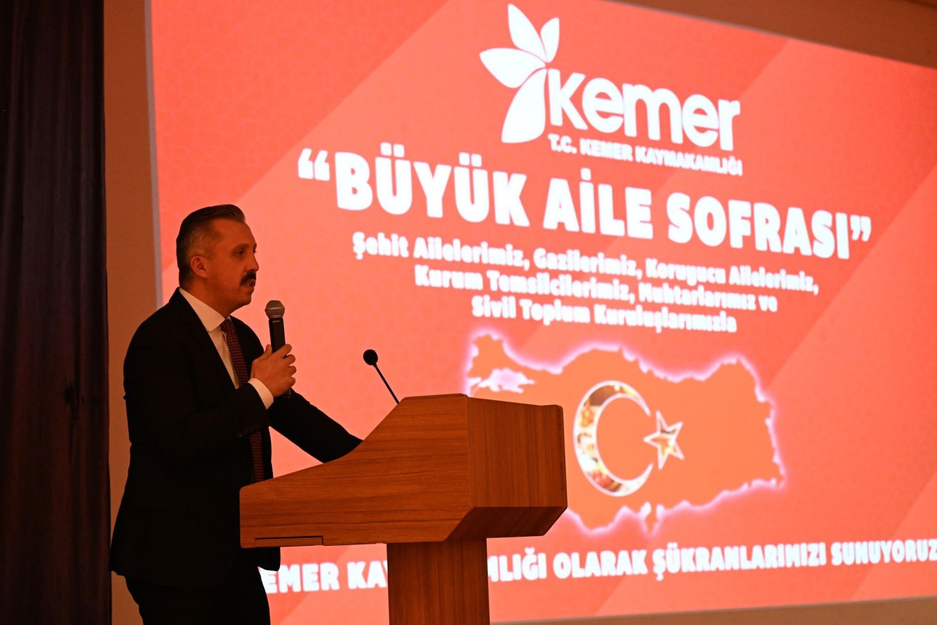 Kemer Kaymakamlığı himayelerinde; şehit aileleri, gaziler, koruyucu aileler, kurum temsilcileri, muhtarlar ve sivil toplum kuruluşlarının katılımıyla “Büyük Aile Sofrası” iftar programı gerçekleştirildi. Kemer’de birlik ve beraberlik duygularının pekiştiği program, Limak Limra Hotel’de düzenlendi. 12 Mart’a denk gelen bu anlamlı günde gerçekleştirilen programda birlik, beraberlik ve dayanışma mesajları verildi.