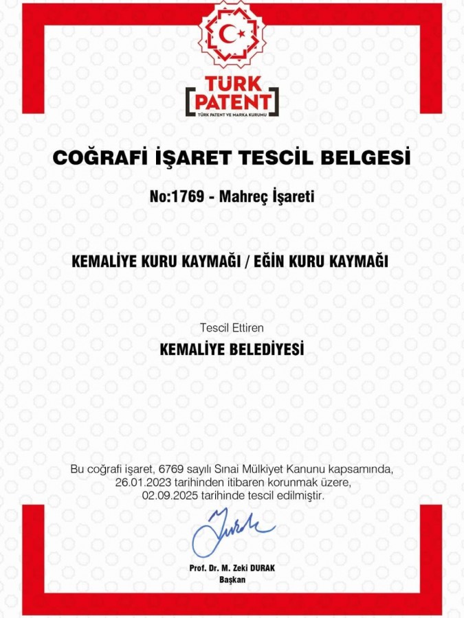 Erzincan Valisi Hamza Aydoğdu, Kemaliye Kapı Tokmağı ile Kemaliye Kuru Kaymağı'nın coğrafi İşaretle tescillendiğini belirterek, "Kadim kültürümüzün iki eşsiz mirası daha tescillendi! İlimizin saklı hazinelerini markalaştırmaya ve dünyayla buluşturmaya kararlılıkla devam ediyoruz" dedi....