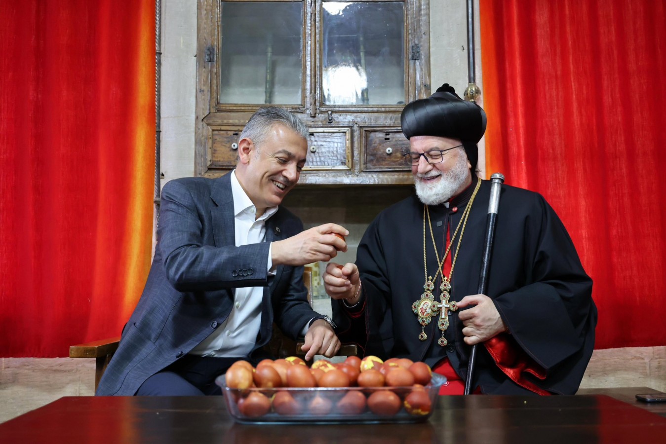 Mardin - Diyarbakır Metropoliti Saliba Özmen ve Süryani vatandaşlar tarafından karşılanan Mardin Valisi Tuncay Akkoyun tüm Hristiyan vatandaşların Paskalya Bayramı’nı tebrik etti. Ziyarette Vali Akkoyun ve Saliba Özmen, Paskalya yumurtası tokuşturdu.