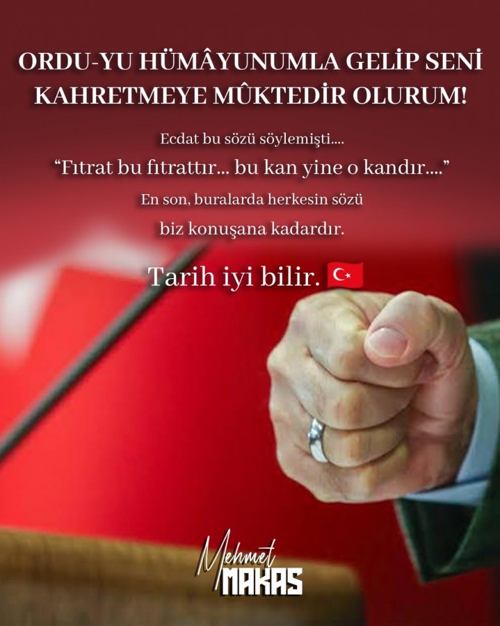 Sosyal medya üzerinden sert bir şekilde mesaj yayımlayan Vali Makas, "Ordu-yu Hümâyunumla gelip seni kahretmeye muktedir olurum!' Ecdat bu sözü söylemişti… Fıtrat bu fıtrattır, bu kan yine o kandır. En son, buralarda herkesin sözü biz konuşana kadardır…Tarih iyi bilir" ifadelerini kullandı.