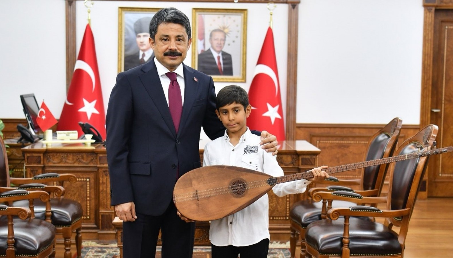 Kırşehir Valisi Murat Sefa Demiryürek, geçtiğimiz ramazan ayında gerçekleştirdiği okul ziyaretleri sırasında kendisini minik davulu ve söylediği manilerle karşılayan Furkan Ertaş’ı unutmadı. Müzik yeteneğiyle dikkat çeken Furkan’ı Valilik makamında misafir eden Demiryürek, Furkan'a bağlama hediye etti.