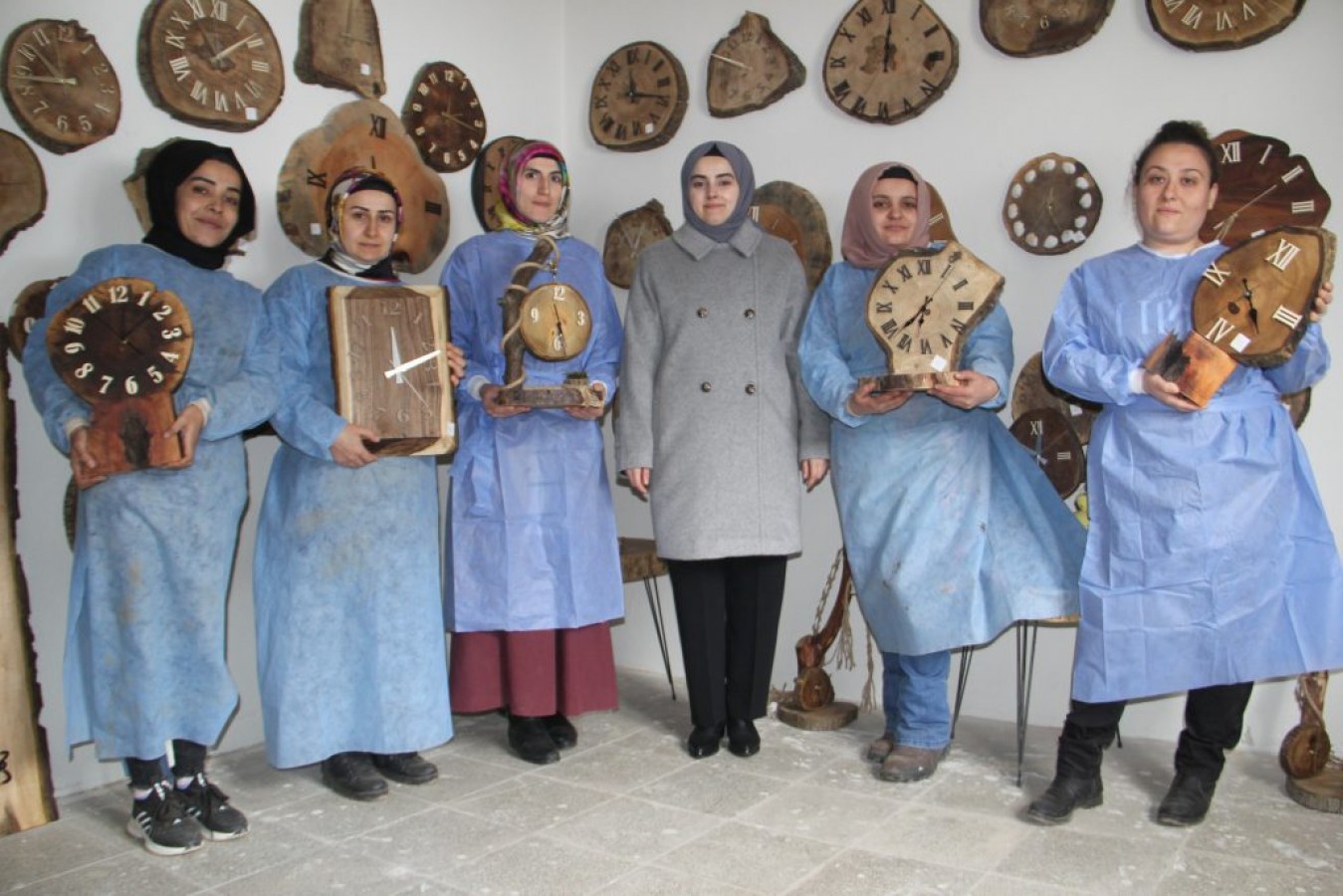 İki usta öğretici gözetiminde tüm işçilikleri el becerileriyle yapan kadınlar, kimi zaman matkap, testere kimi zaman da mengene, ağaç soyma makinesi ve hızar kullanarak ürettikleri saatleri satıp aile bütçelerine katkı sağlıyor.