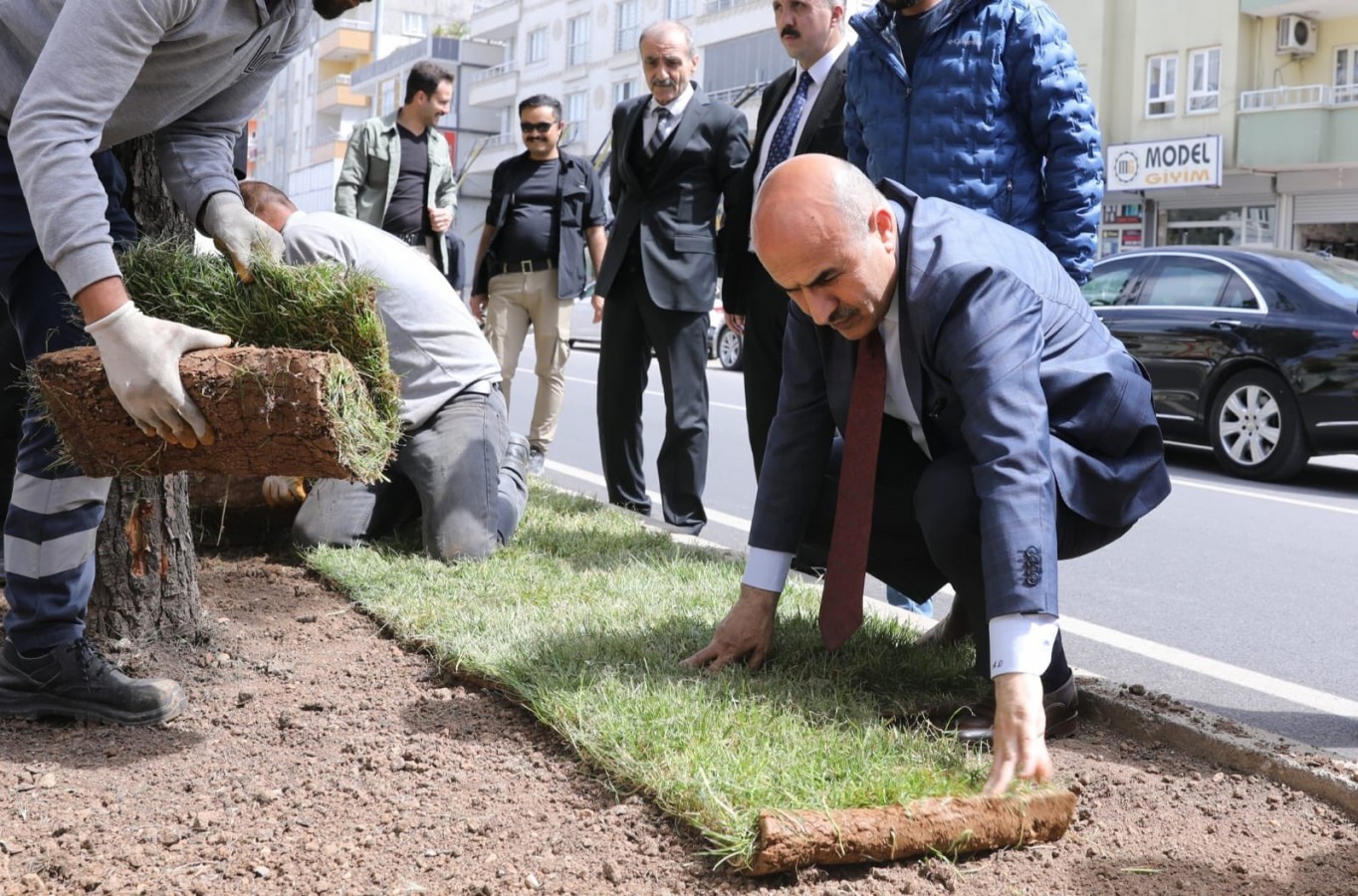 sulama, yürüyüş yolu yapımı, orta refüjlerde çim serimi çalışmalarına devam etti.
